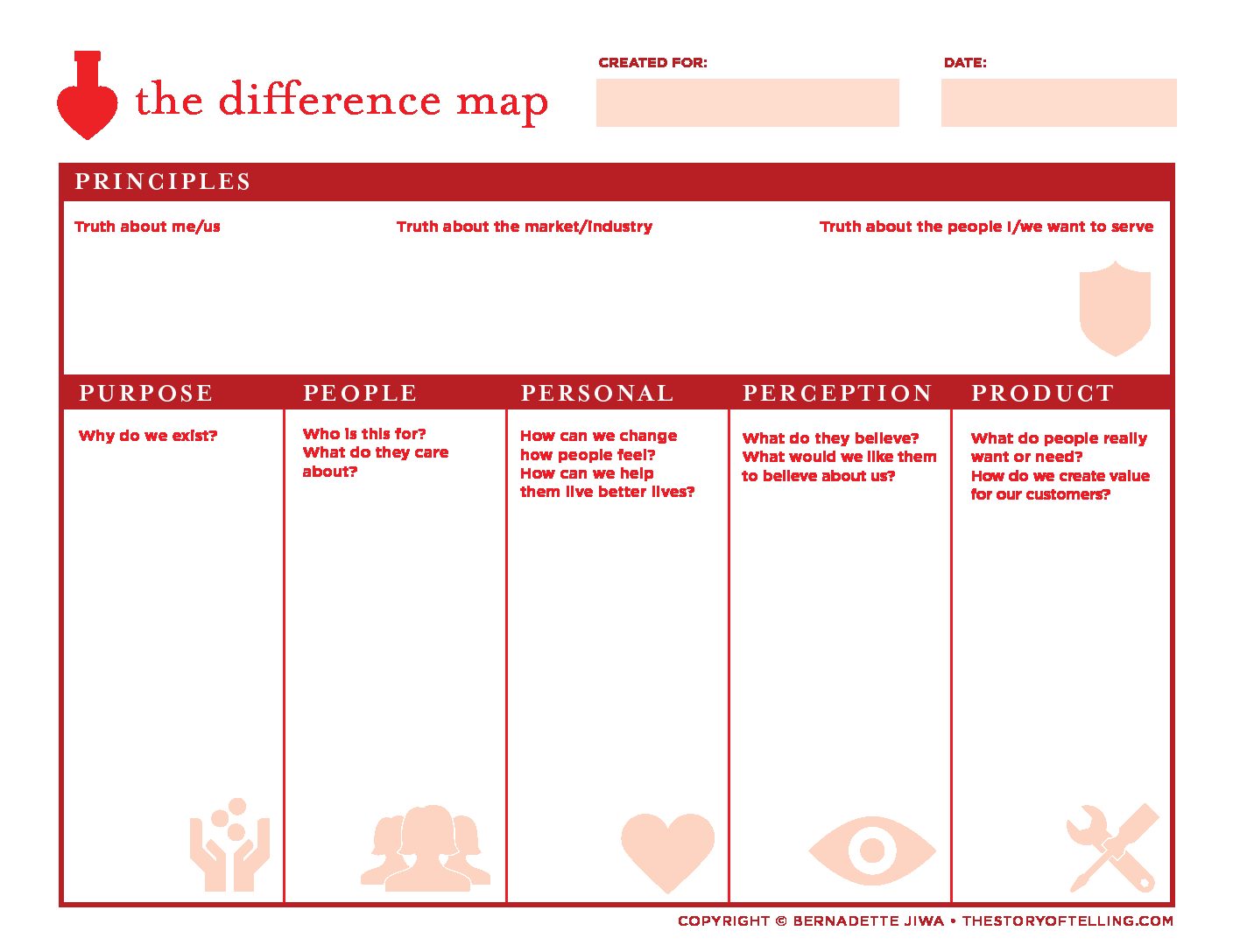 The Difference Map, by the inspirational Bernadette Jiwa, is a one-page method for thinking about your business from a fresh perspective and figuring out how to let people know why your difference should matter to them.